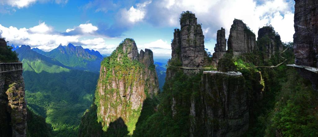 西北部的岩溶峰林,三三两两地散布在平原之上。北帝山素有“广西张家界”之称,悬崖栈道蜿蜒其间,石林如剑戟挺立,登顶可邂逅云海翻涌,感受“会当凌绝顶,一览众山小”的豪迈。