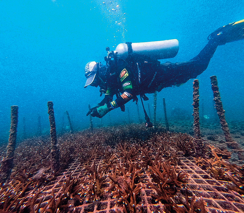 受气候变化、海水温度升高等多重因素影响,这里的珊瑚礁生态系统不断遭受破坏,珊瑚覆盖率下降约70%,自然恢复能力基本丧失。