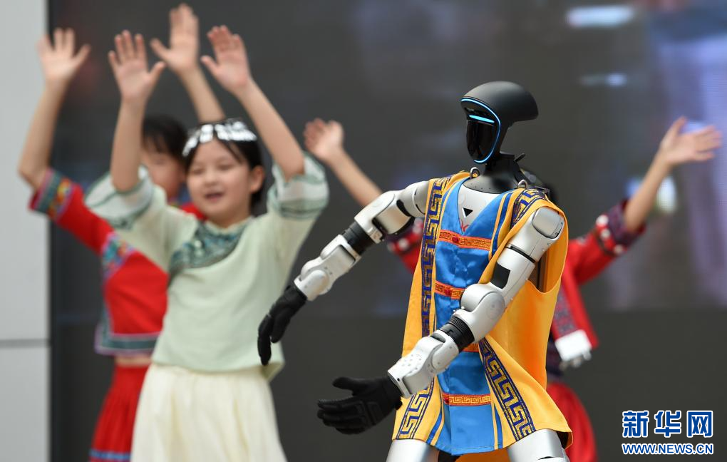 4月13日,在广西南宁市滨湖路小学教育集团滨湖校区,机器人和学生一起表演节目。