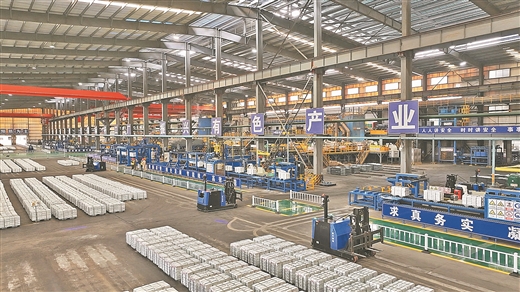 南方有色金属有限责任公司生产车间内,无人叉车和自动桁架机器人高效协作,为生产减负增速。韦明宇/摄