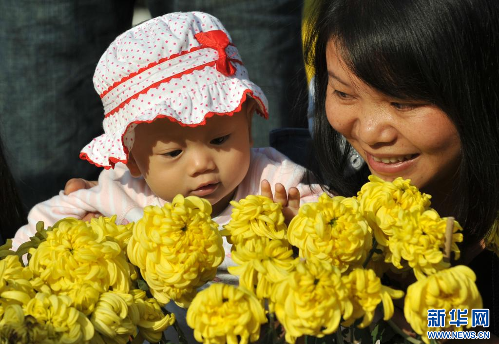 一名市民带着小孩在南宁市南湖广场欣赏菊花(2012年11月18日摄)。