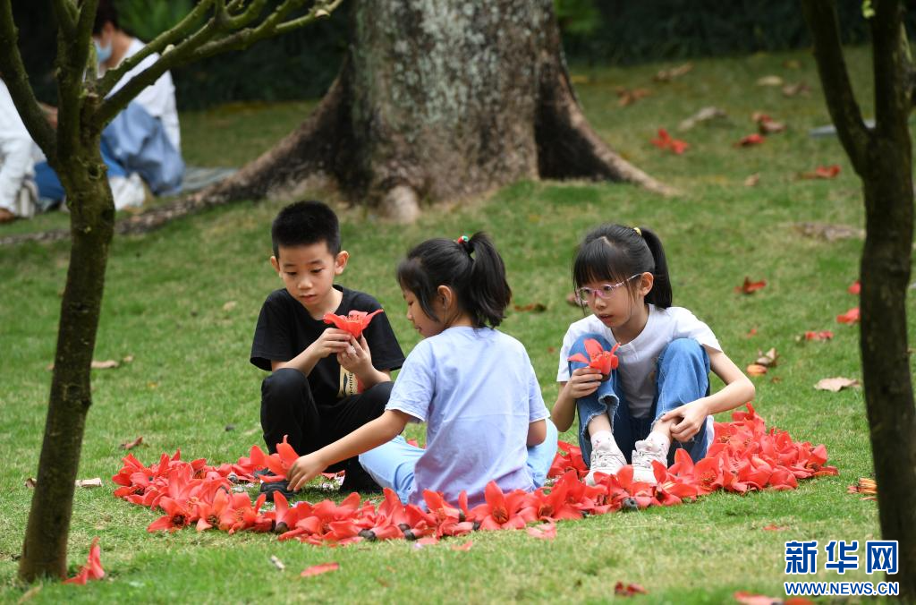 在南宁市金花茶公园,几名小朋友在捡拾掉落的木棉花摆放玩耍(2022年3月20日摄)。