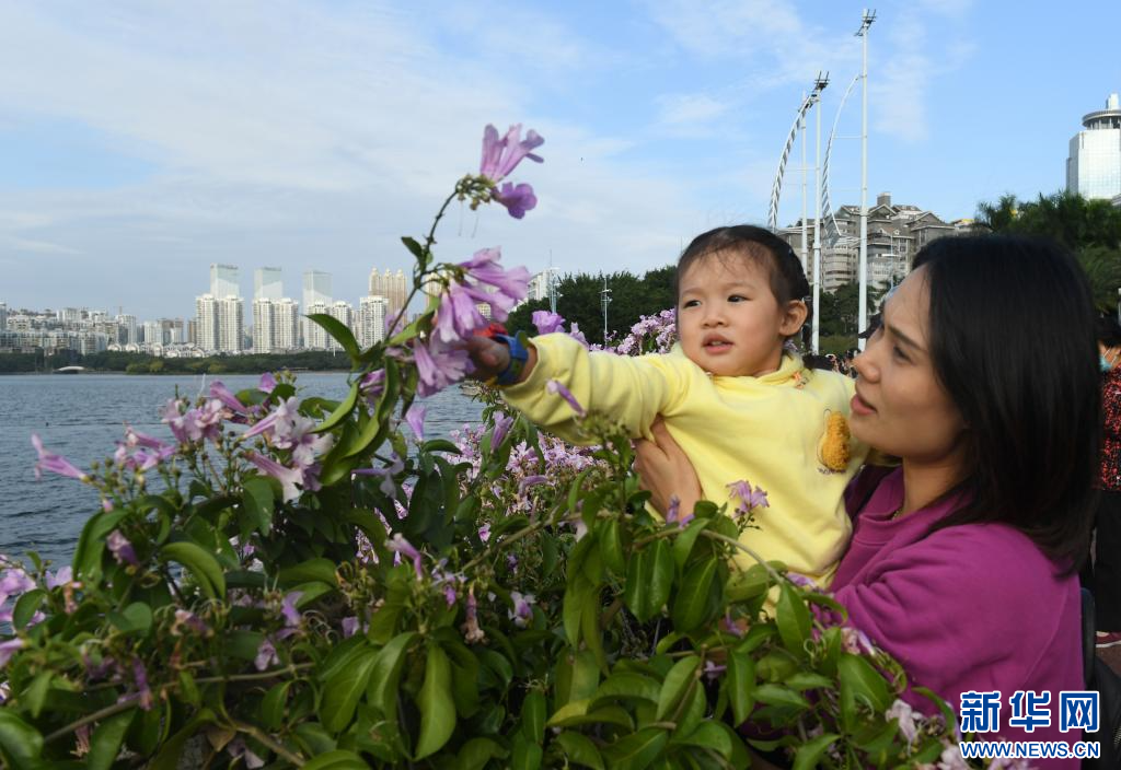 一名小朋友和妈妈在南宁市南湖边赏花(2021年11月23日摄)。