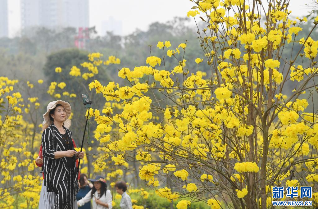 市民在南宁市江南公园内赏花(2022年3月15日摄)。