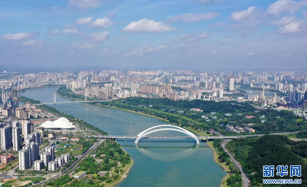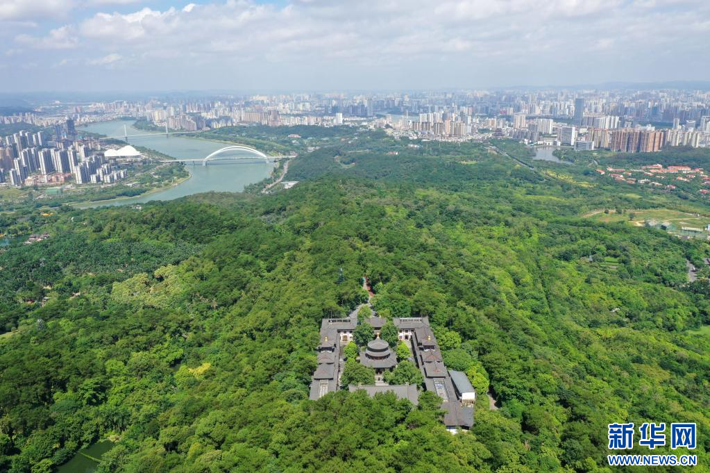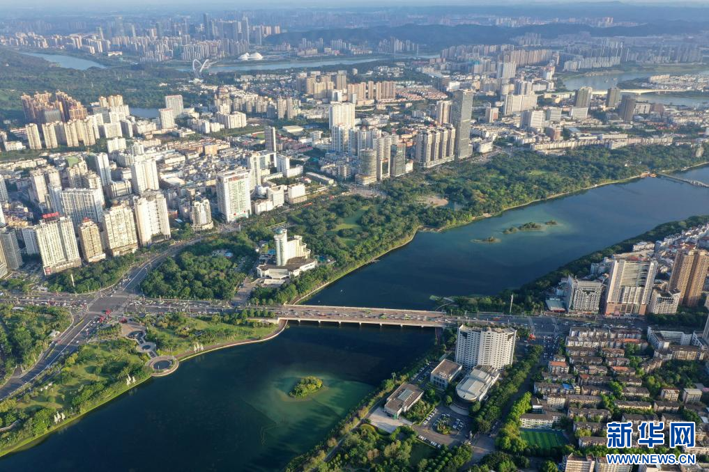 这是南宁市青秀山、邕江及周边建筑群组成的“半城绿树半城楼”城市景观(无人机照片,2021年7月14日摄)。