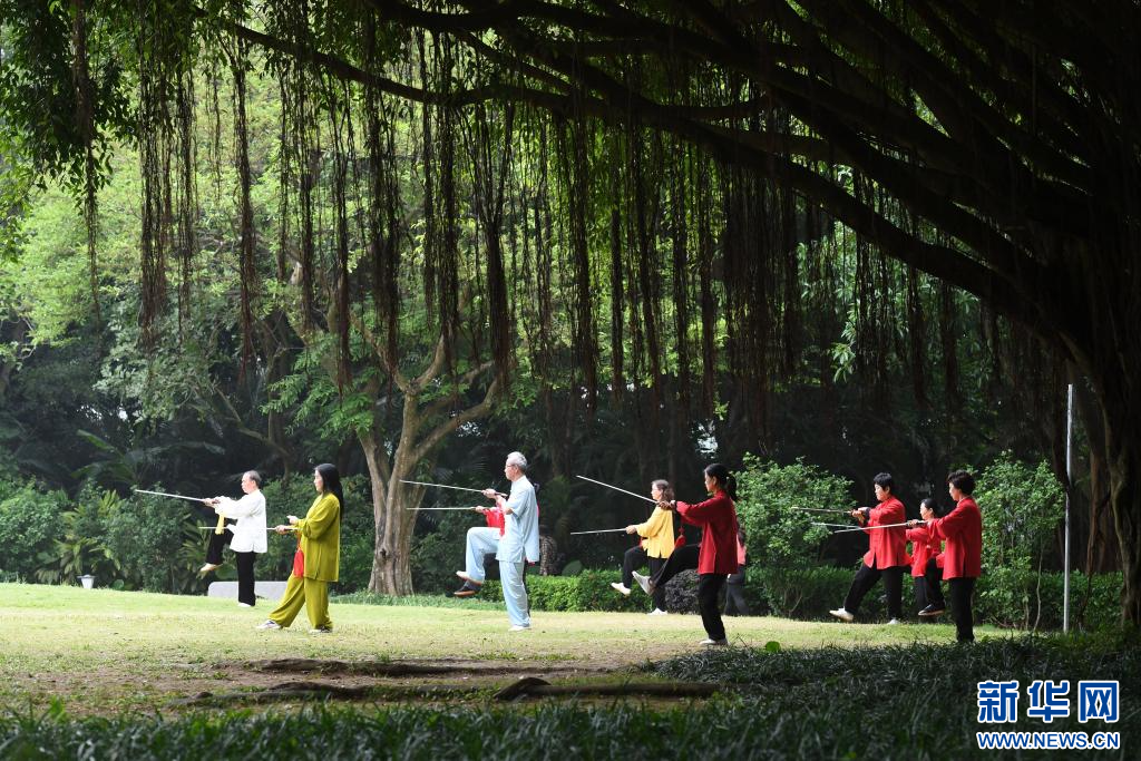 市民在南宁市南湖边的榕树下健身(2022年4月21日摄)。