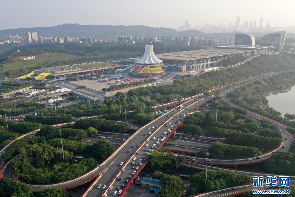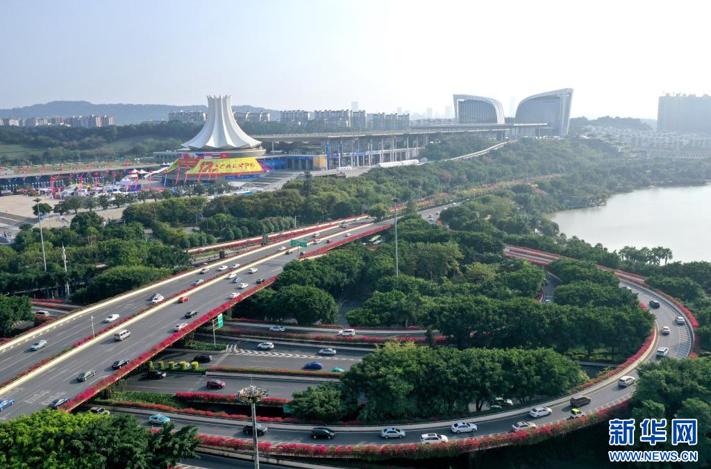 这是绿树红花掩映中的南宁国际会展中心及周边建筑(无人机照片,2020年11月26日摄)。