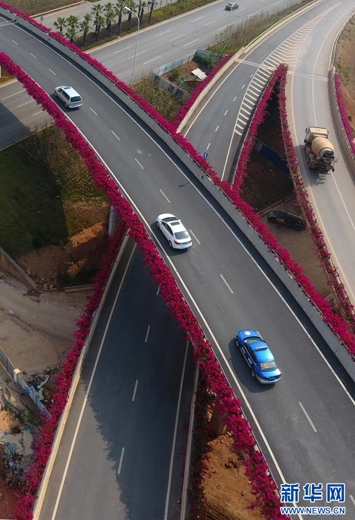 车辆从开满鲜花的南宁市竹溪立交桥经过(2019年8月31日摄)。
