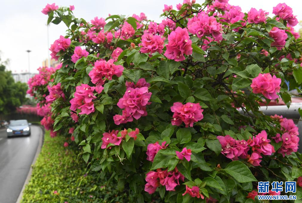 市民在南宁市青环路欣赏盛开的三角梅(2019年3月30日摄)。