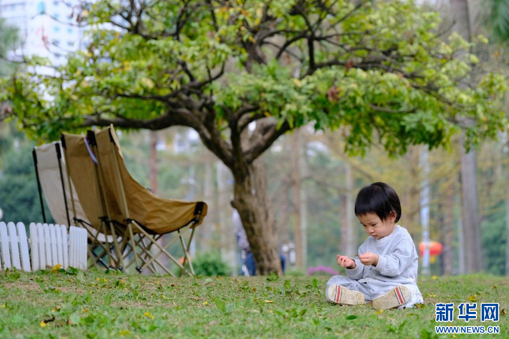 一名小朋友在南宁市南湖边绿地上玩耍(2026年2月23日摄)。