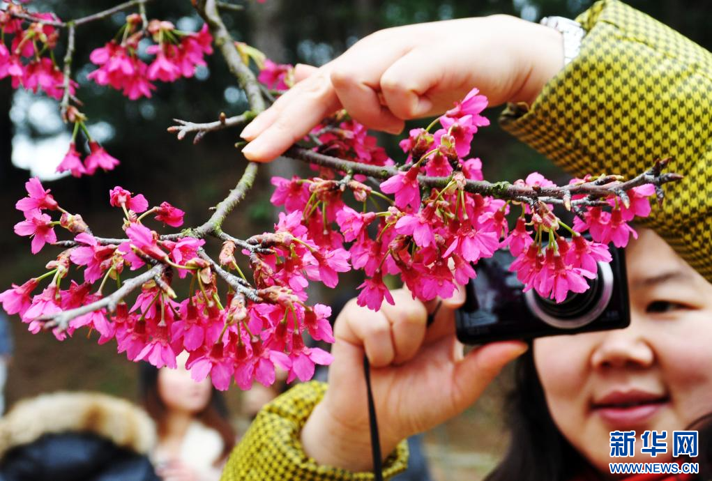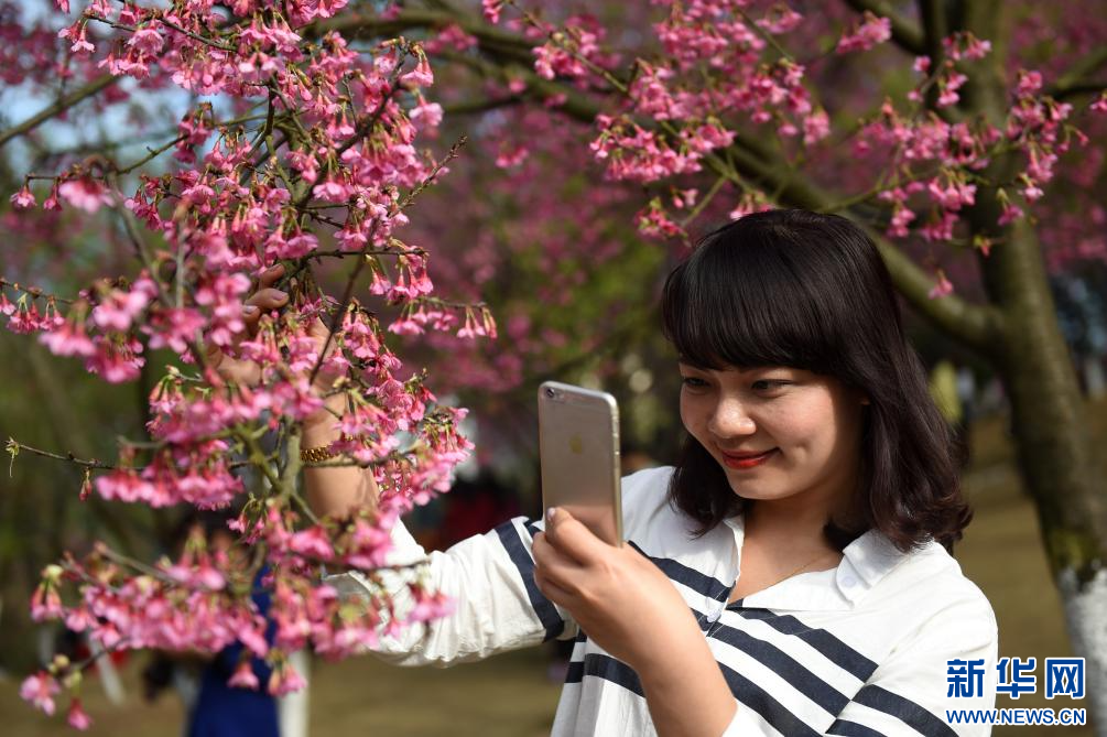 一名游客在南宁市石门森林公园拍摄樱花(2016年2月28日摄)。