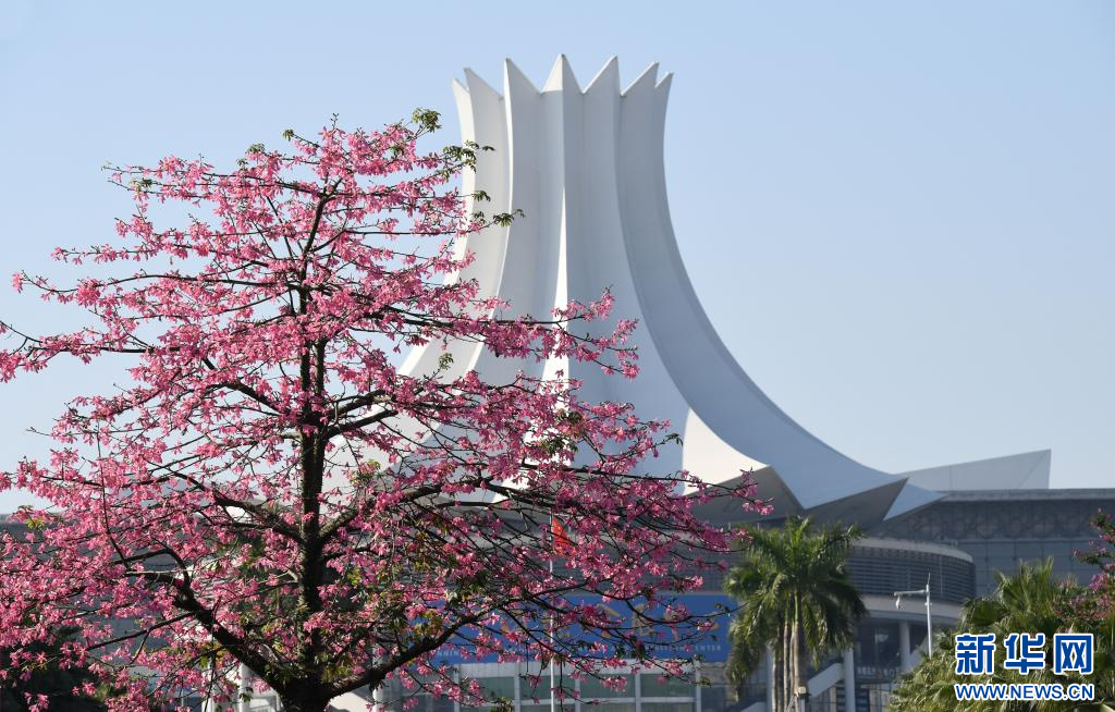 这是掩映在红花绿叶中的南宁国际会展中心(2021年12月7日摄)。