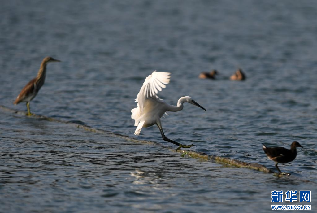 鸟儿在南宁市南湖上嬉戏(2021年10月11日摄)。