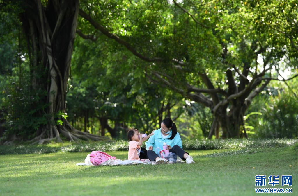 市民在南宁市南湖边榕树荫里休闲(2021年10月12日摄)。