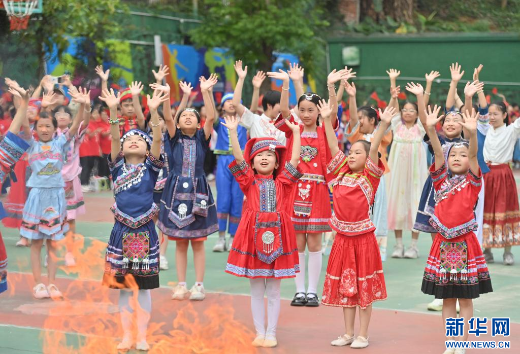 4月16日,在梧州市龙圩中心小学集团举行的“三月三”民族团结主题实践活动中,小学生们在跳篝火舞。