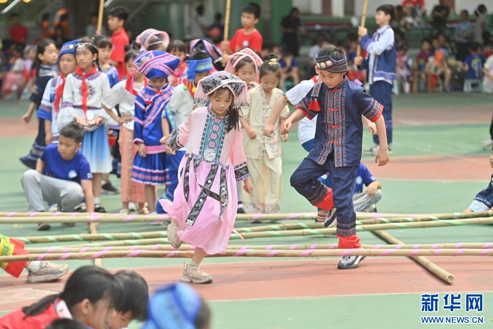 4月16日,在梧州市龙圩中心小学集团举行的“三月三”民族团结主题实践活动中,小学生们在跳竹竿舞。