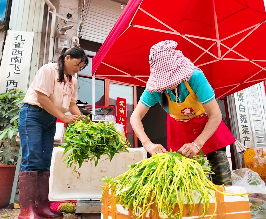 近年来,博白县立足水蕹产业优势,通过“公司+合作社+农户”的发展模式,推动水蕹产业向标准化、规模化、集约化方向稳步发展。合作社为菜农统一提供种苗、技术指导和收购服务,全程指导菜农采用绿色种植技术,严格把控产品品质。同时,借助电商平台、农产品展销会等多种渠道,博白水蕹不仅远销广东、海南等周边省份,还通过真空包装走向全国各地。截至目前,博白空心菜种植面积约1.2万亩,总产量约3.6万吨,产值达1.8亿元,成为当地群众增收的“致富菜”。(李博 刘元耀)