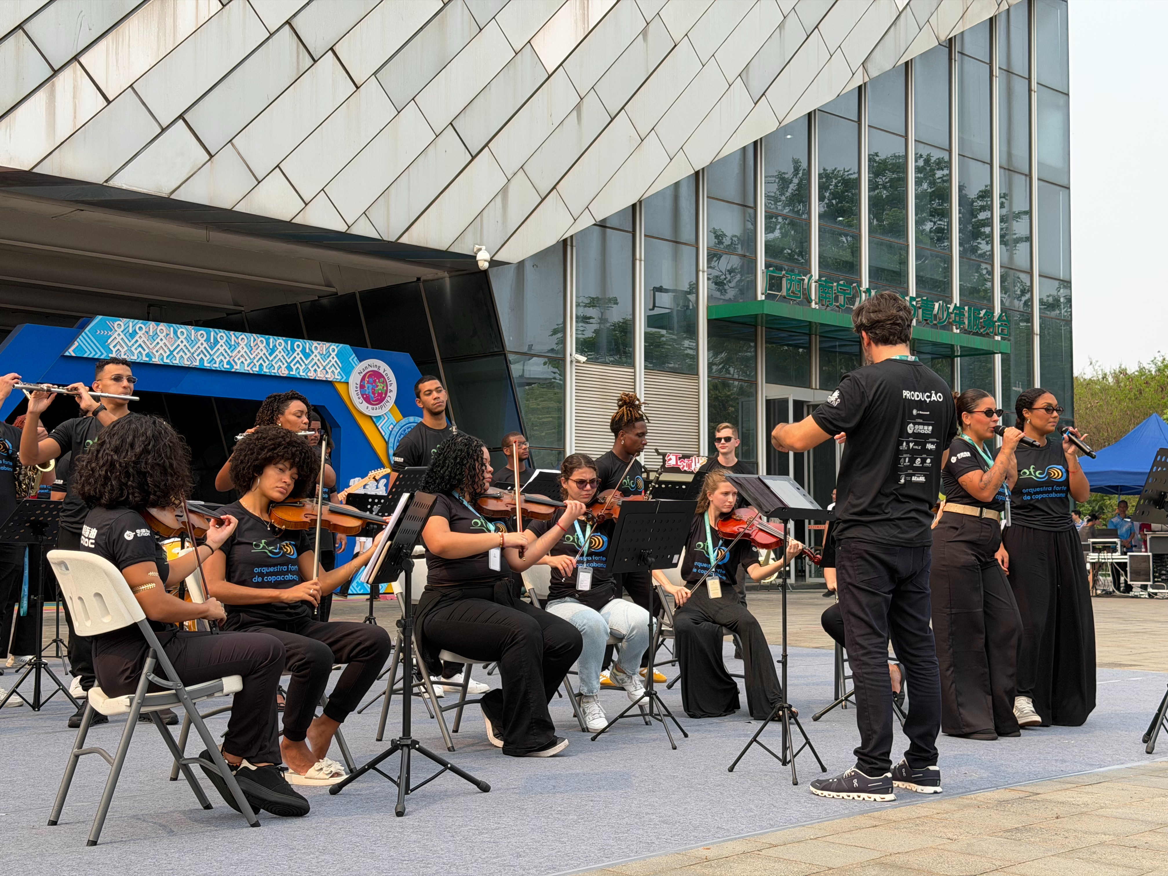 在南宁市青少年活动中心,巴西乐手还与身着当地传统民族服饰的孩子们同台合作演唱《如愿》。巴西乐手边奏边唱,孩子们则负责和声,器乐与人声交织在一起,温暖而流畅。看着孩子们认真投入、全情歌唱,贡迪姆说,自己深受触动。她还提到,观众热情的回应,一下子拉近了彼此的距离。