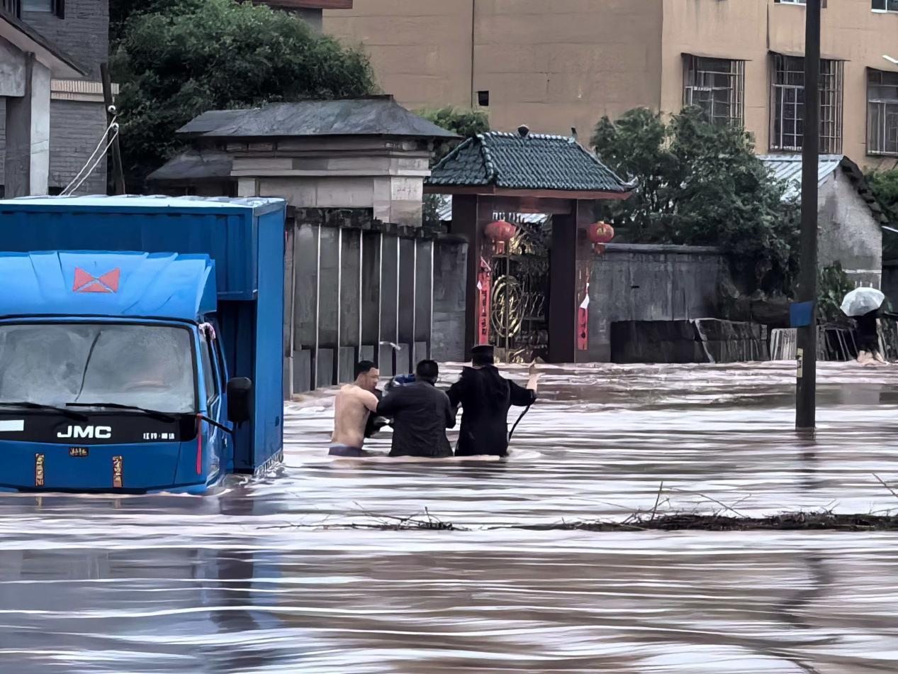 4月20日上午,龙水镇部分主干道被洪水淹没,水流湍急。两名老人骑行电动自行车途经积水路段时,车辆被洪水冲翻,周边多名群众被困。龙水派出所民警辅警接警后,立即涉水赶往现场。民警手挽手在洪水中搭起“人链”,背负儿童、搀扶群众,在齐腰深的积水中将被困人员全部转移至安全地带,随后又将熄火车辆推离积水区域。