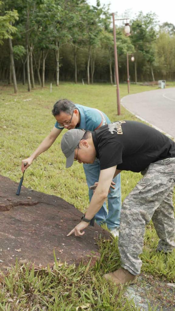 莫进尤(后)与邢立达(前)观察滨江步道的恐龙足迹岩层。(受访者供图)