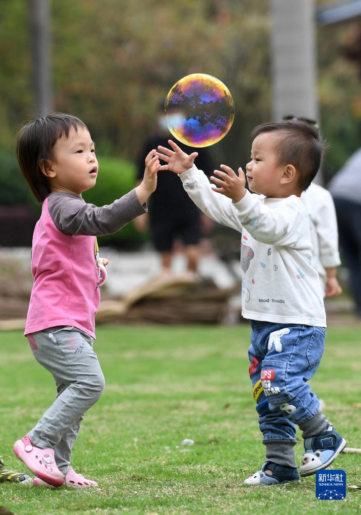 3月20日,小朋友在广西南宁市金花茶公园玩耍。