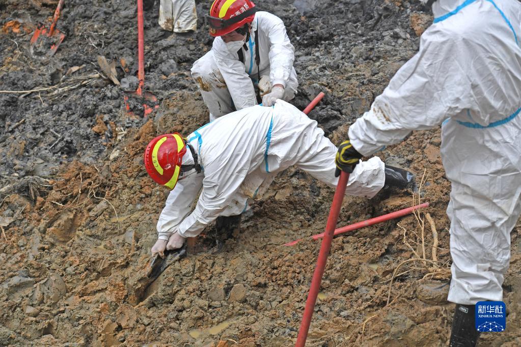 3月25日,搜救人员在事故核心现场拔出陷入泥里的鞋子。新华社记者 周华 摄