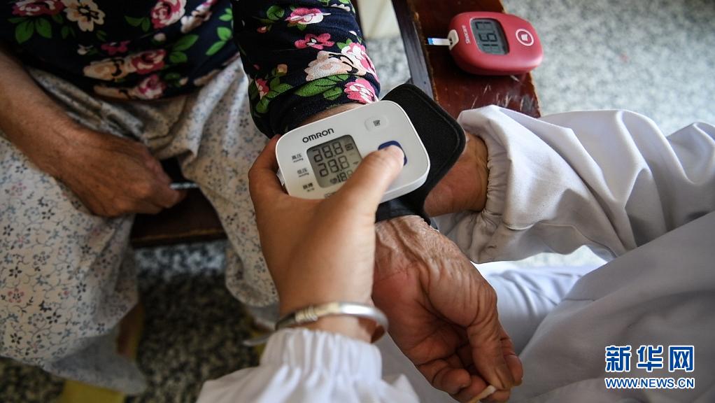 在融安县长安镇隘面村,王雪丹上门为一名老人测量血压(5月18日摄)。