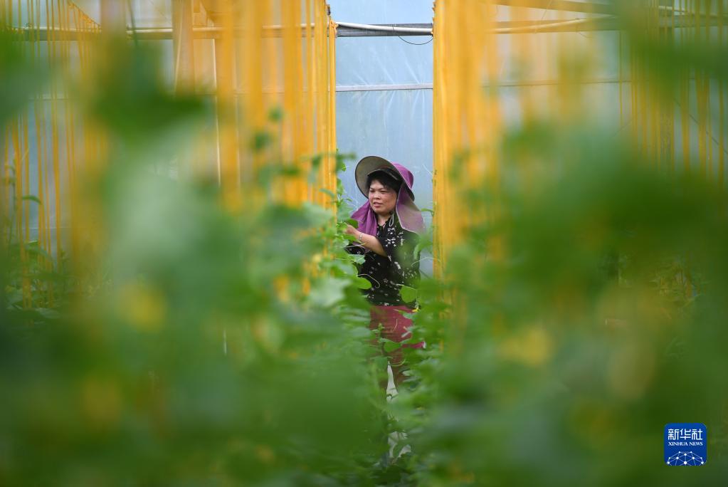在广西贺州市钟山县公安镇大棚蔬菜基地,工人在管护蔬菜(5月26日摄)。