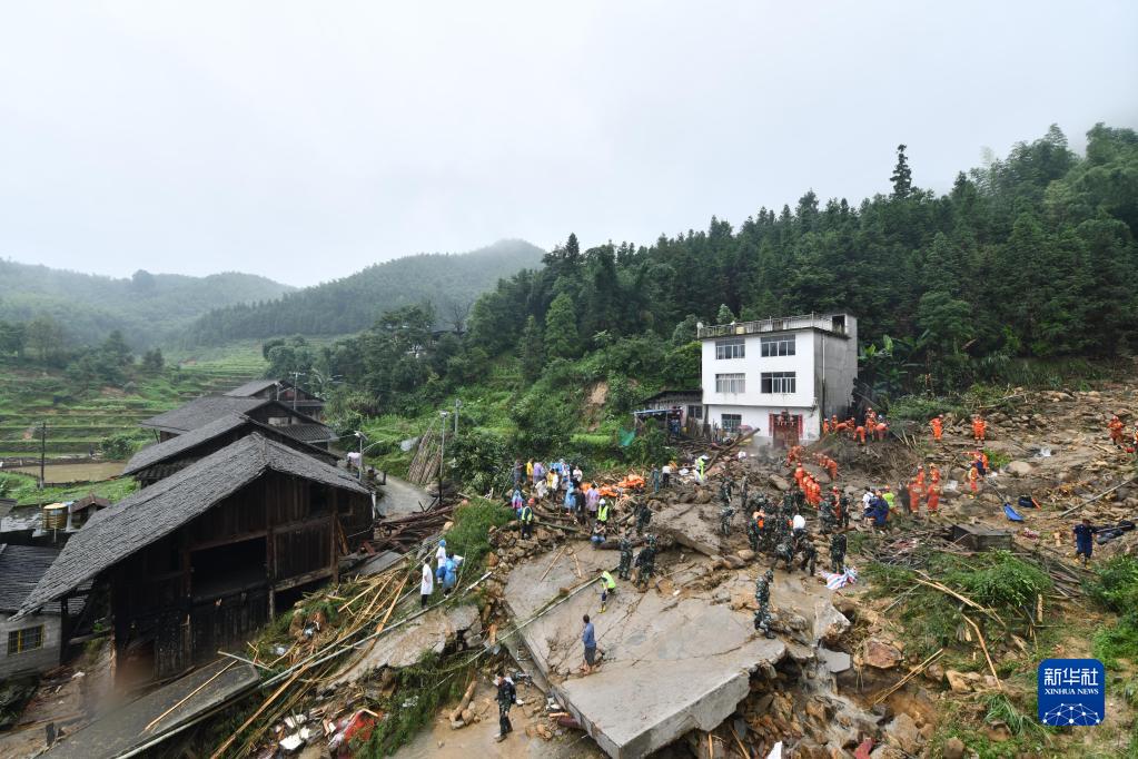 6月18日,在广西融水苗族自治县香粉乡古都村,救援人员开展搜救工作。