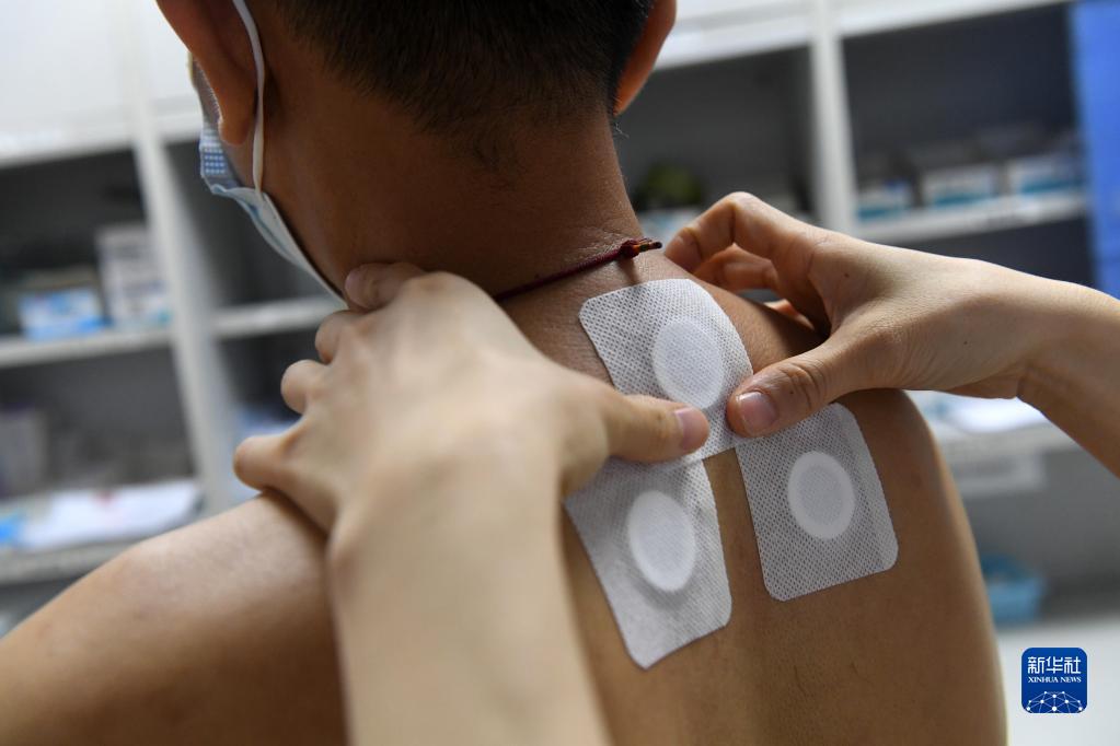 7月6日,在广西南宁市青秀区方园社区卫生服务中心,医务人员在为市民贴“三伏贴”。