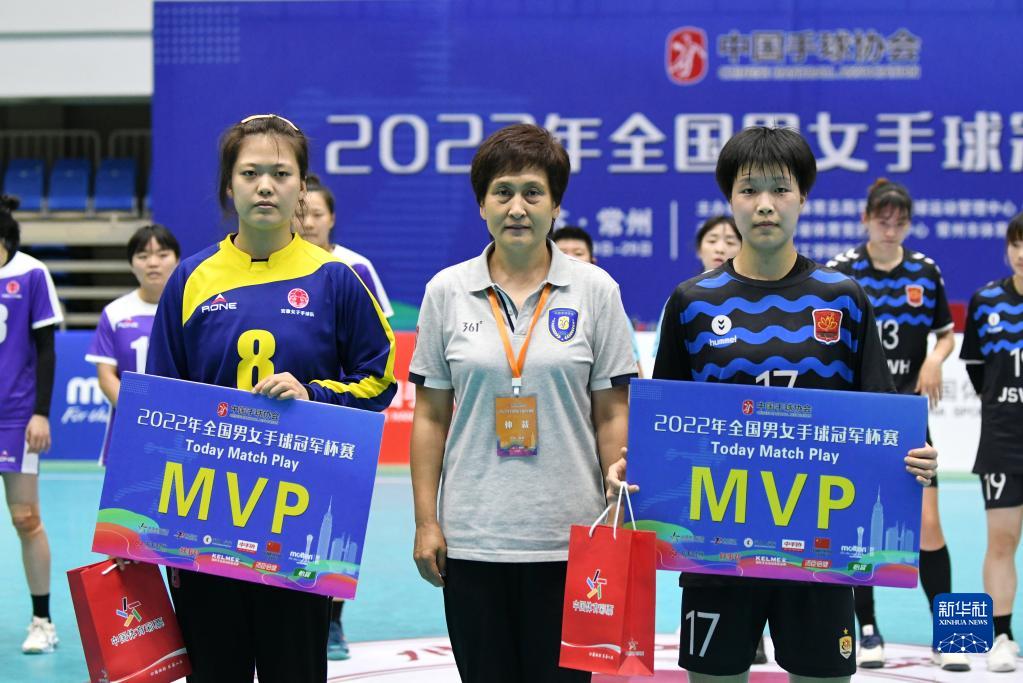7月28日,安徽队球员徐仕媛(前左)和广西队球员王铃娜(前右)获得本场比赛最有价值球员(MVP)。