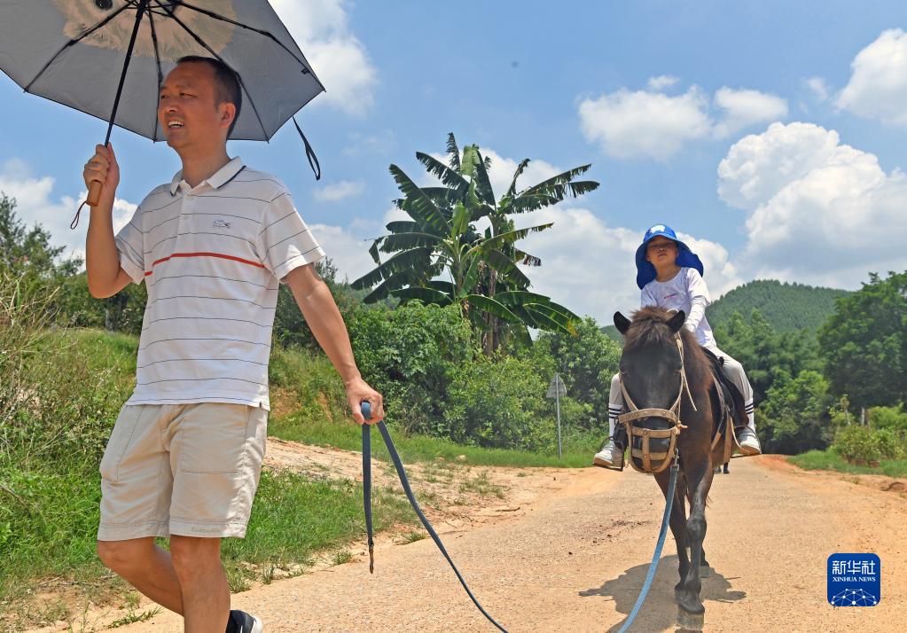 暑假期间,广西南宁市一些家长带着孩子走进市郊马场,在山林中寻求野趣,在户外感受乡村风情。