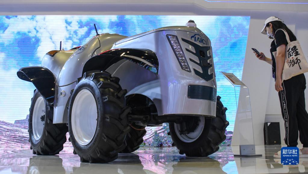 9月17日,一名参观者在观看一款无人驾驶拖拉机。