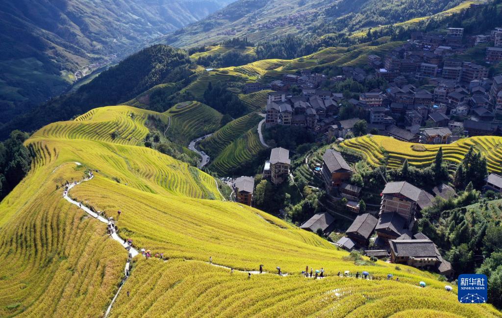 10月3日,在广西龙胜各族自治县龙脊梯田景区,游客们乐享梯田美景。