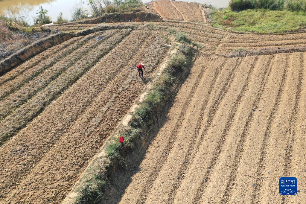 1月30日,村民在广西南宁市青秀区仙葫经济开发区那舅社区那平村平整田地(无人机照片)。