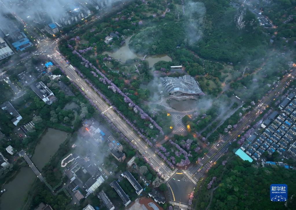 4月10日在广西柳州市洋紫荆盛开的学院路上拍摄的车流(无人机照片)。