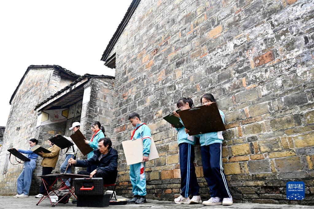 4月10日,在柳城县古砦仫佬族乡大户村滩头屯,几名学生跟随老师在民居旁写生。