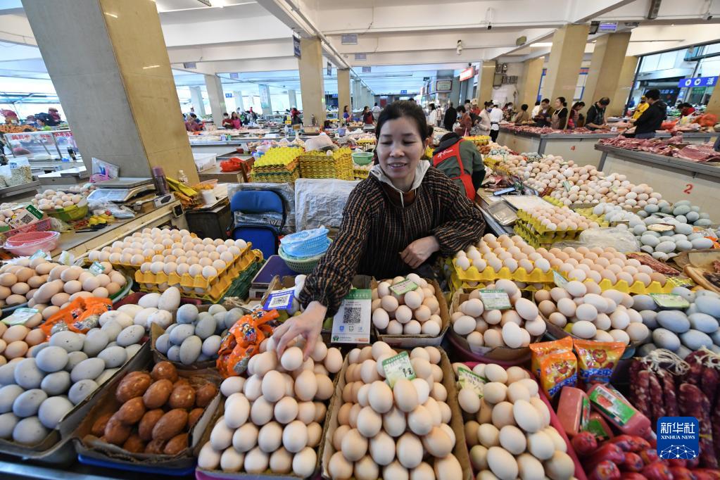 4月11日,在广西南宁市一家农贸市场,一名商户在摆放鸡蛋等待销售。
