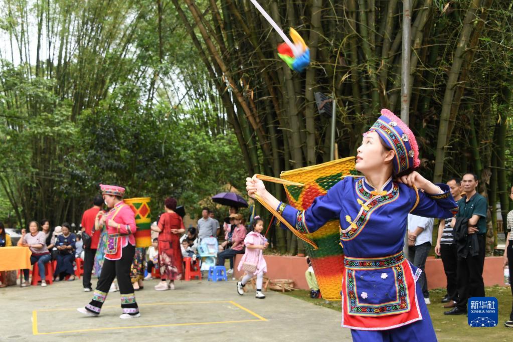 4月21日,在罗城县米椎林景区,人们参加抛接绣球比赛。