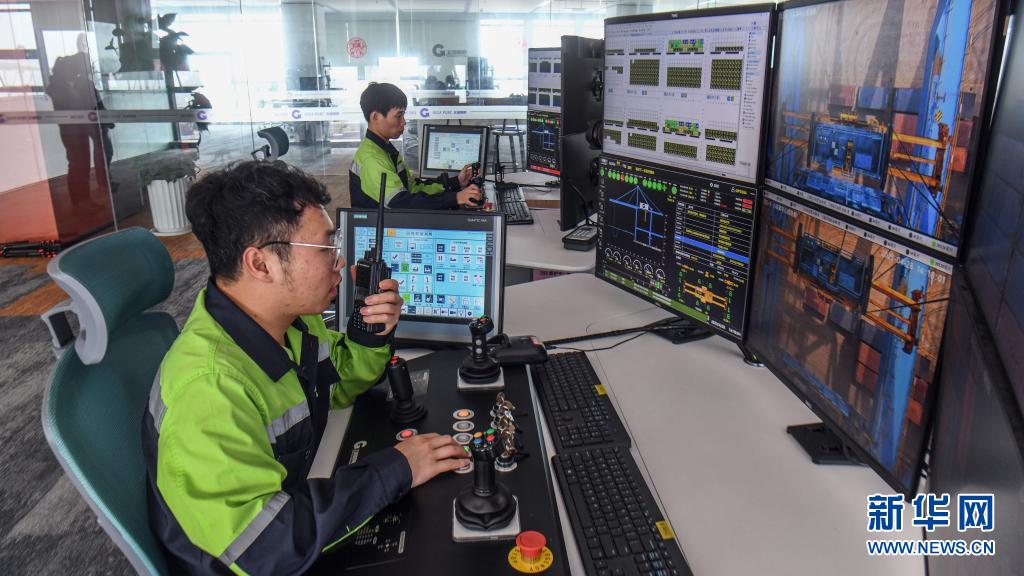 在钦州自动化集装箱码头,工人在通过智能控制系统调运集装箱(4月28日摄)。