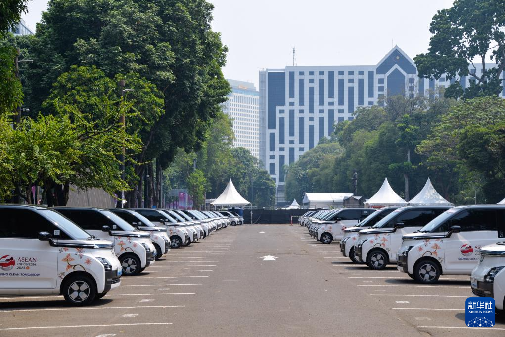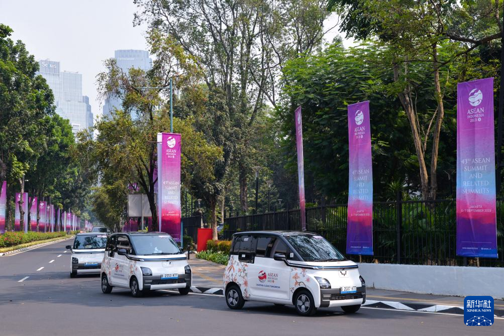 这是9月6日在印度尼西亚雅加达第43届东盟峰会会场外拍摄的五菱新能源车Air ev。