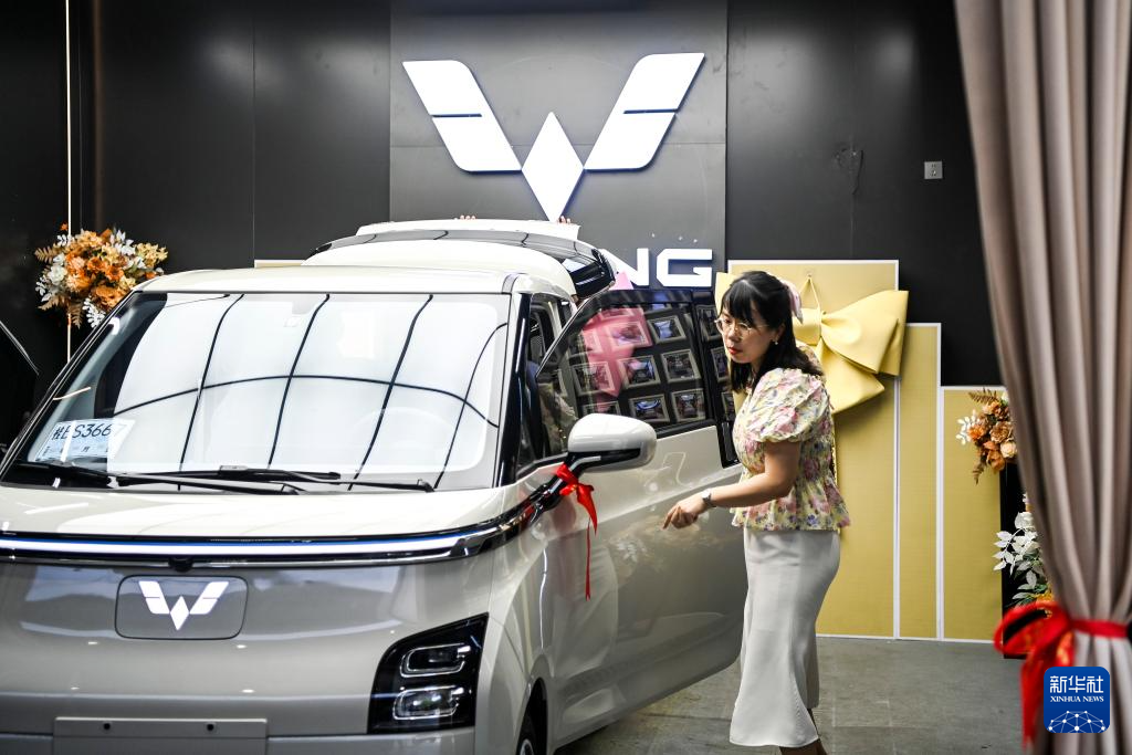 在广西柳州市一家新能源汽车销售店内,一位车主提验新车(7月20日摄)。