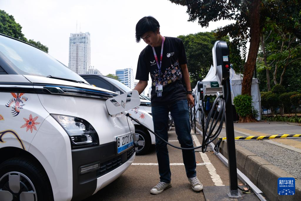 9月6日,在印度尼西亚雅加达第43届东盟峰会五菱汽车服务站,工作人员为一辆五菱新能源车Air ev充电。
