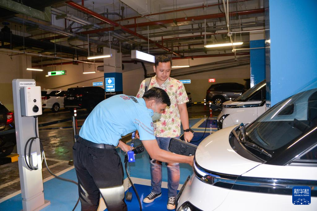 9月29日,在印度尼西亚雅加达一家商场的地下停车场,工作人员为一位五菱新能源车Air ev车主结束充电。