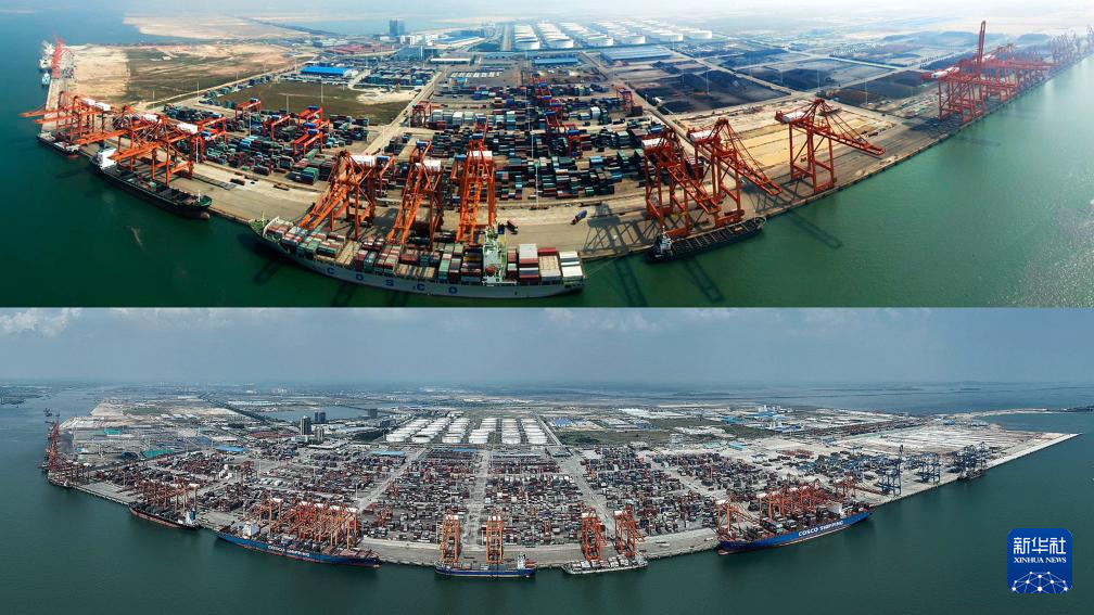 拼图照片:上图为2015年的钦州港(2015年10月23日摄,无人机照片);下图为2022年的钦州港(2022年9月13日摄,无人机照片)。