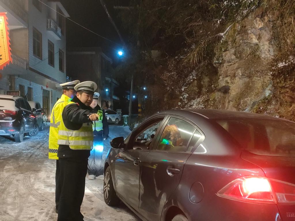 1月22日晚,执勤交警在长陔岭对通行车辆进行劝导和安全提示。(安徽省黄山市歙县公安局交通管理大队王村中队供图)