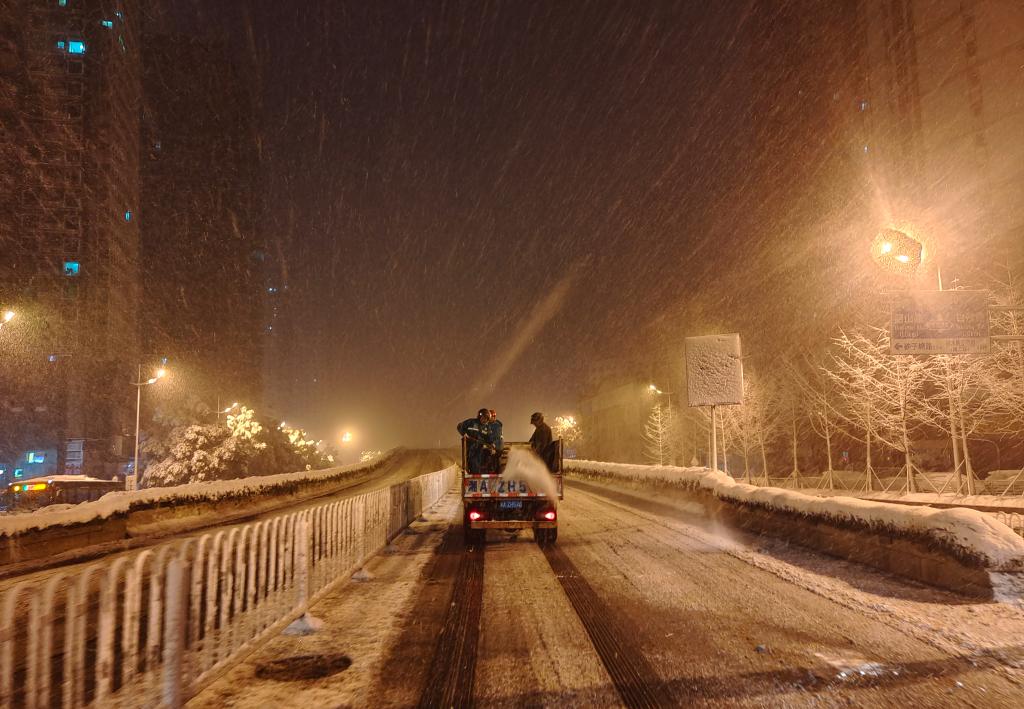 1月22日凌晨,湖南省长沙市天心区城管局、区环卫中心工作人员上路抛洒融雪剂。(天心区环卫中心供图)