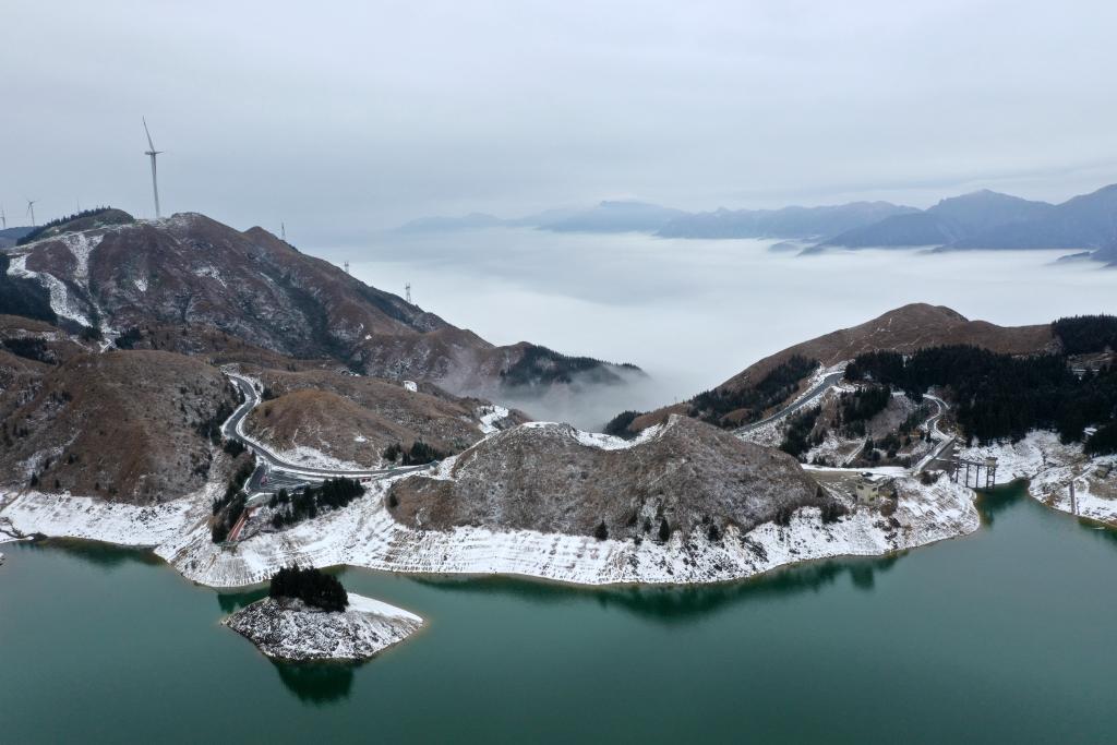 这是1月26日拍摄的广西全州县天湖雪景(无人机照片)。