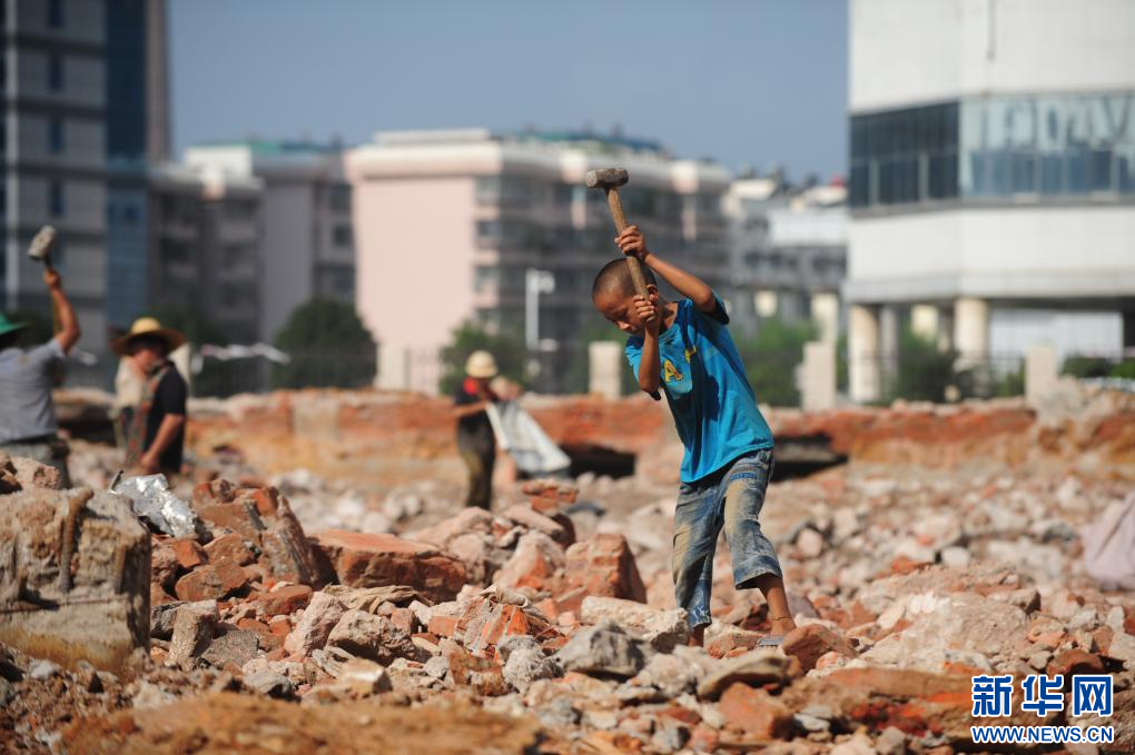 在柳州市北雀路一工地,熊三耶在挥锤“打铁”(2013年8月29日摄)。