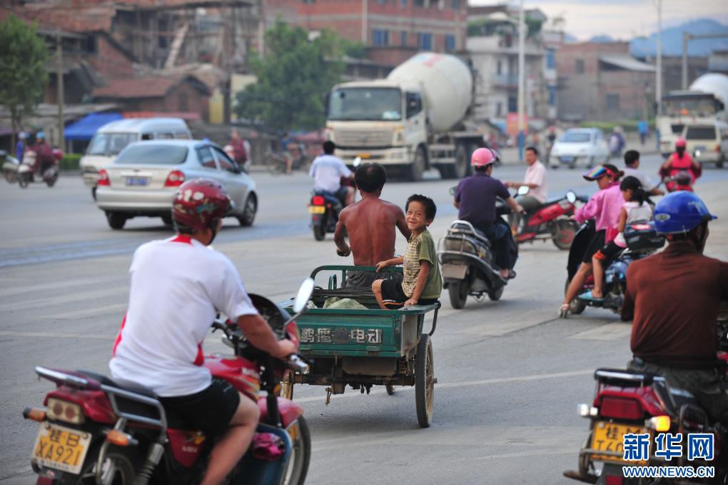 在柳州市街头,熊三耶和爸爸外出“打铁”(2011年7月29日摄)。